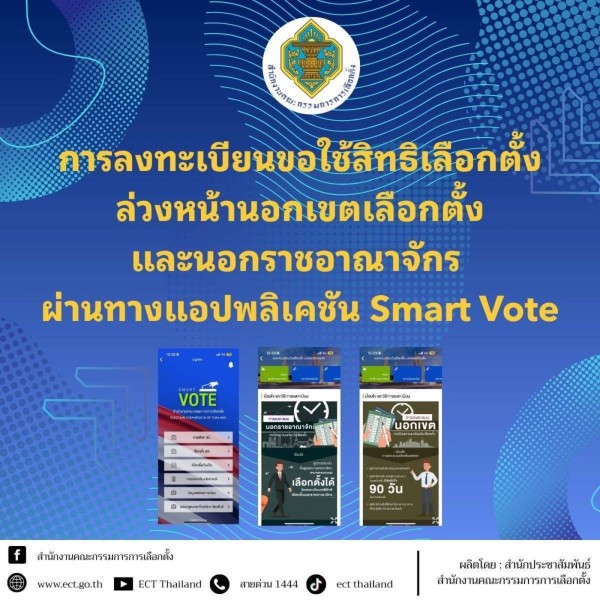 📢 สำนักงานคณะกรรมการการเลือกตั้ง (กกต.) แจ้งประชาชนว่า ตั้งแต่วันที่ 20 ธันวาคม 2568 ถึง 5 มกราคม 2569 สามารถ ลงทะเบียนขอใช้สิทธิเลือกตั้งล่วงหน้านอกเขตเลือกตั้ง และนอกราชอาณาจักร ผ่านแอปพลิเคชัน Smart Vote ได้ ตลอด 24 ชั่วโมง ✅ โดย ไม่ต้องส่งเอกสารประกอบการลงทะเบียน สะดวก รวดเร็ว ปลอดภัย