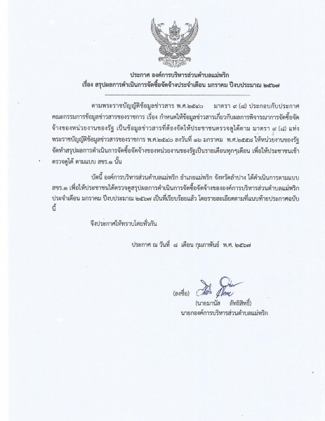 สรุปผลการดำเนินการจัดซื้อจัดจ้างประจำเดือน มกราคม 2567 ปีงบประมาณ 2567