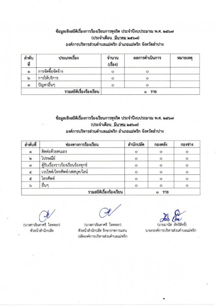 ข้อมูลเชิงสถิติเรื่องการร้องเรียนการทุจริต ประจำปีงบประมาณ พ.ศ.2567 (ประจำเดือน มีนาคม 2567)